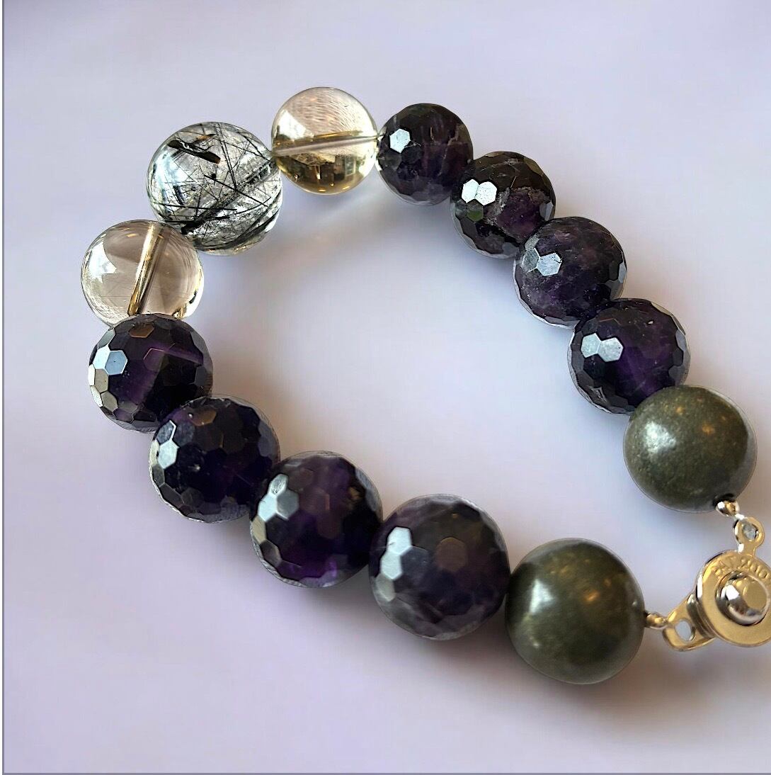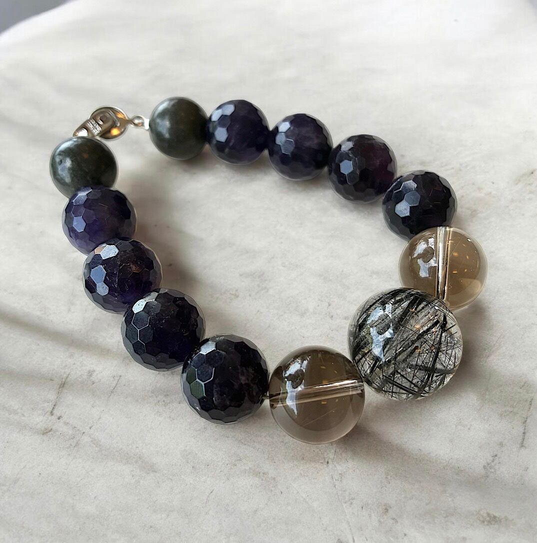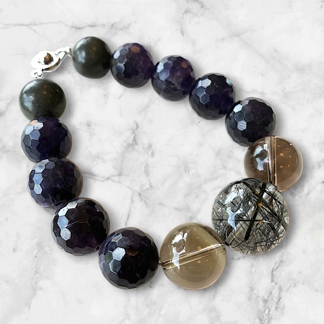トルマライズ・スモーキークォーツ・アメジスト・パイライト入りブレスレットです♪
