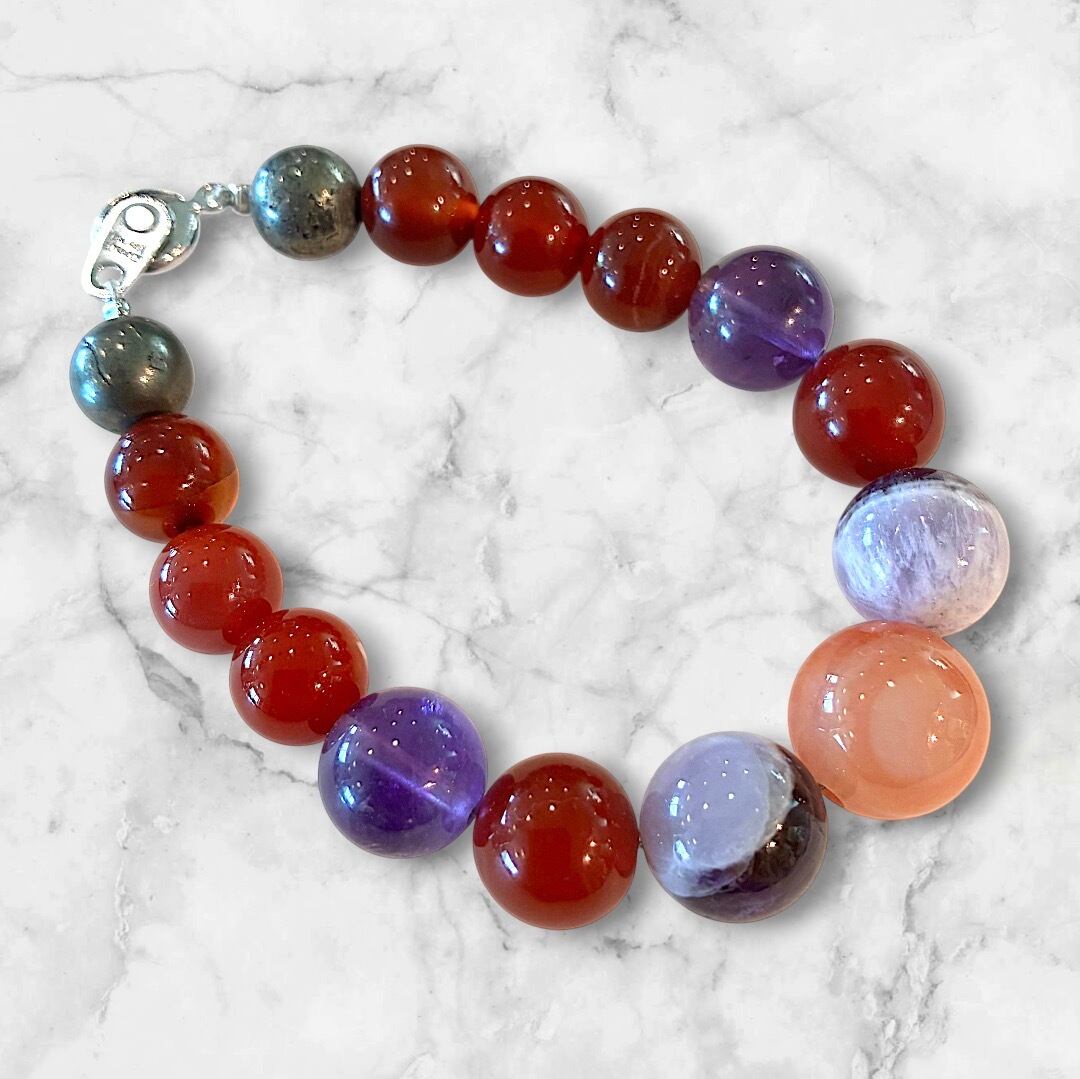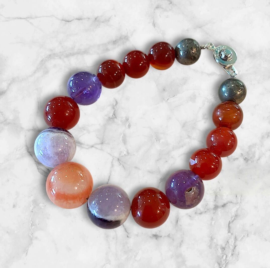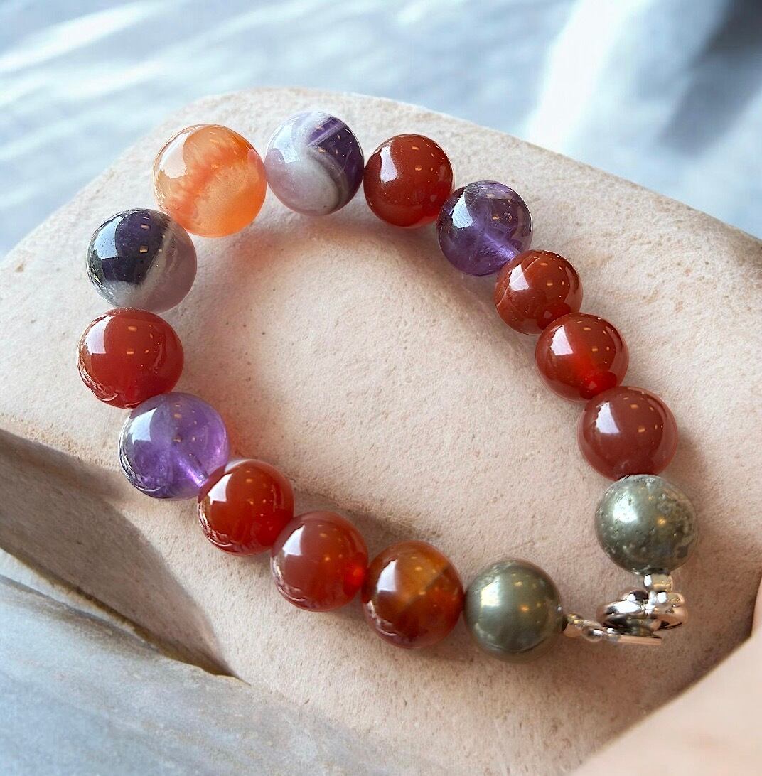 赤天眼石・アフリカンアメジスト・カーネリアン・アメジスト・パイライトが入ったカラフルなブレスレットです♪