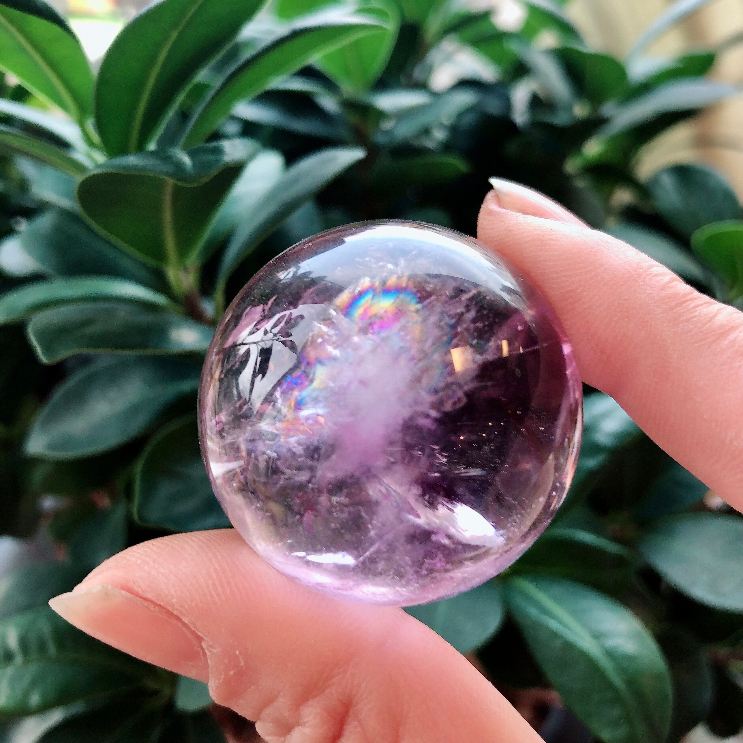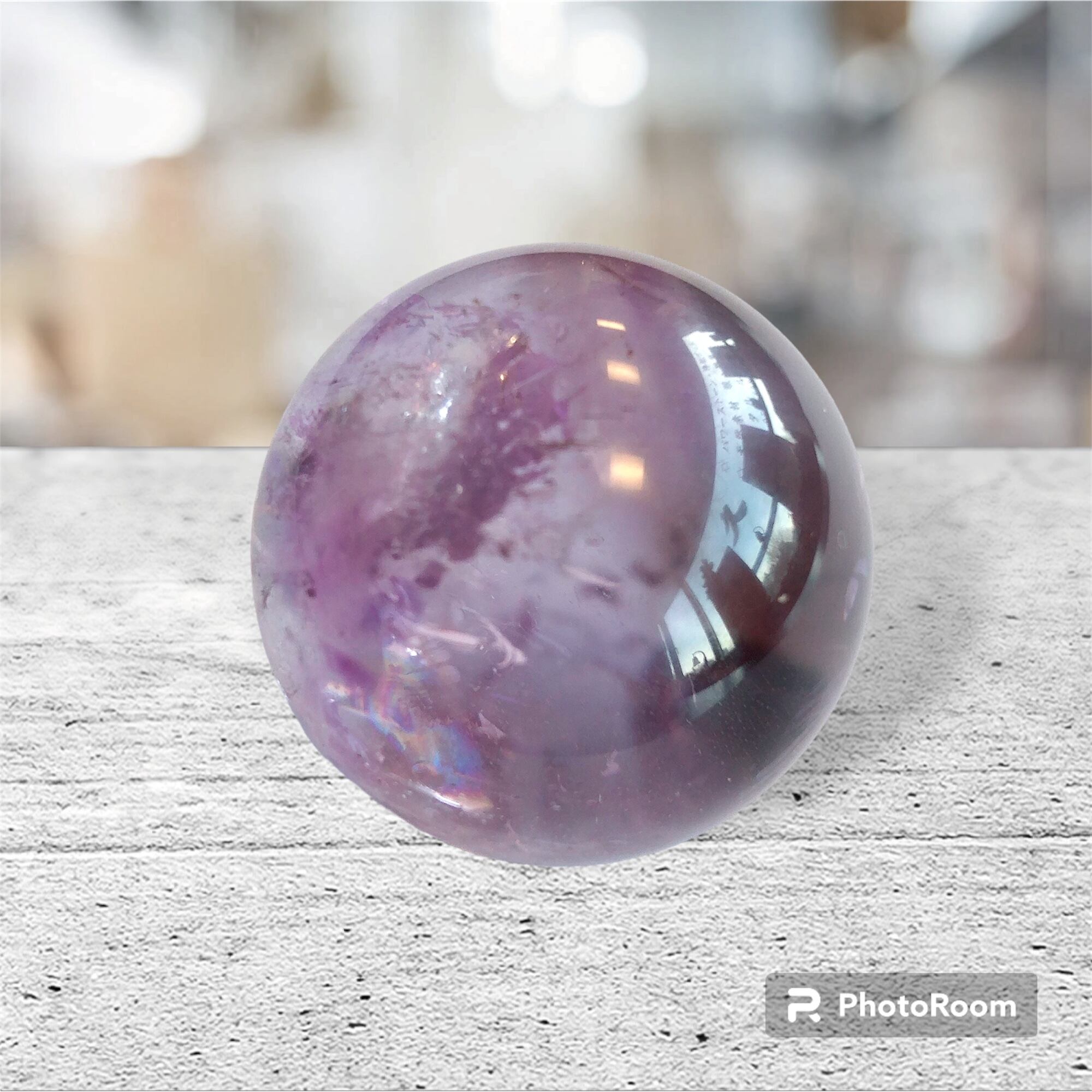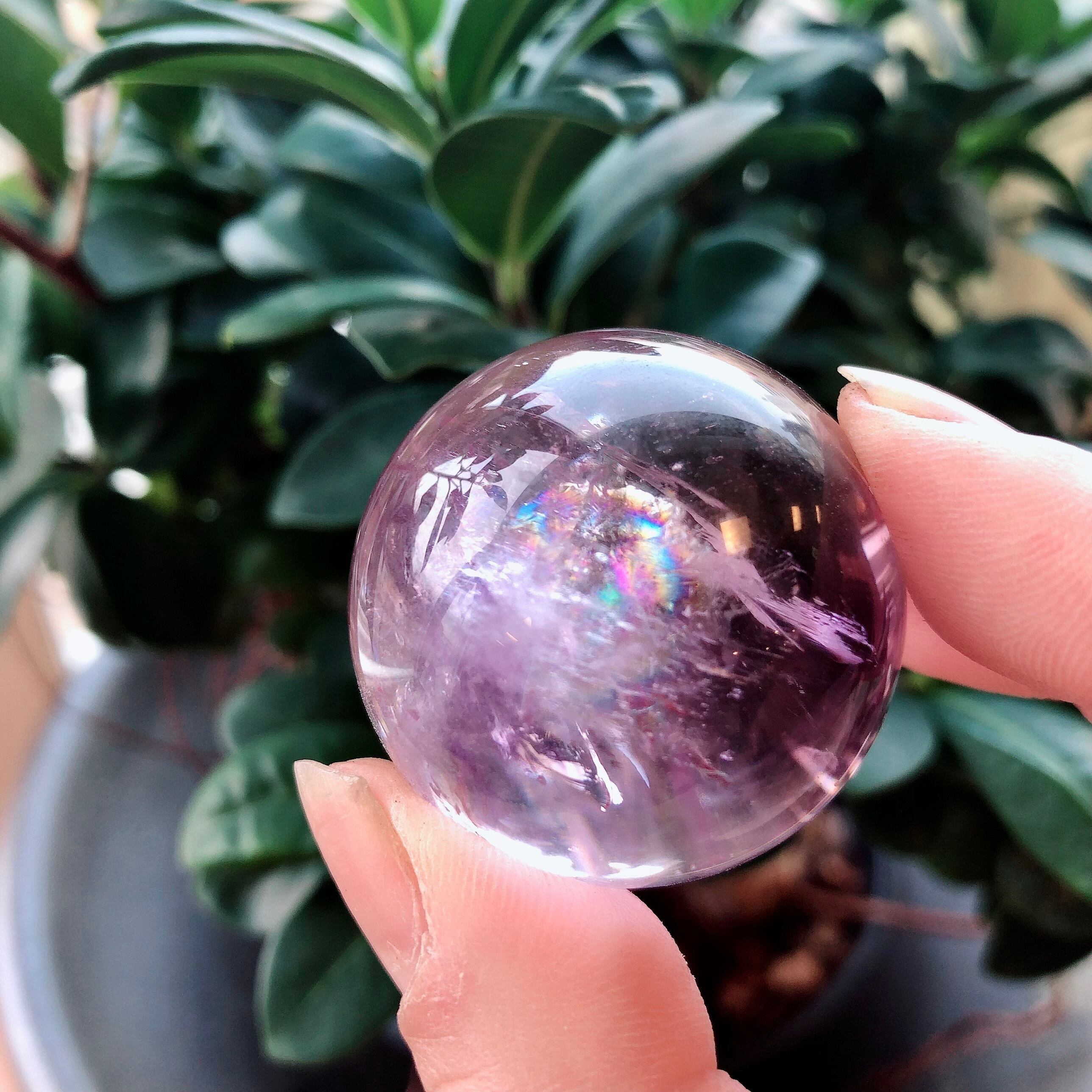 淡いバイオレットカラーにに美しいレインボーが広がる魅力的なアメジストの丸玉です♪